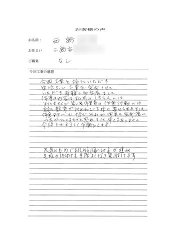 ![]() | お客様の声: 満足した工事をしていただきました。 |