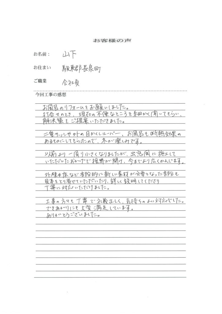 お名前:下妻 お住まい:沼津市 ご職業 作業の方々の対応はとても良く、話も 暑い中ご苦労様でした。 今後もよろしくお願いします。 追伸、感想をと漠然と求められるより